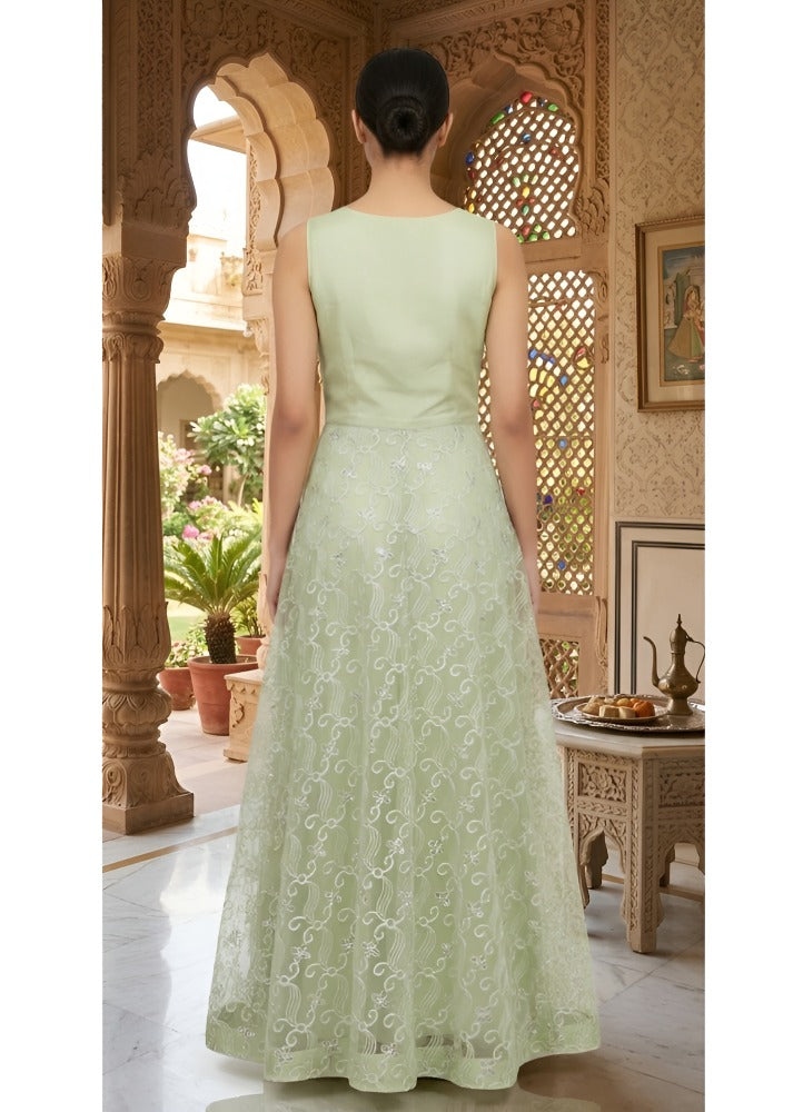 Sleeves: Separate plain Net fabric in the same Pista Green color is conveniently attached inside the gown. This allows you the flexibility to easily add sleeves if desired, customized to your preferred style and length.
